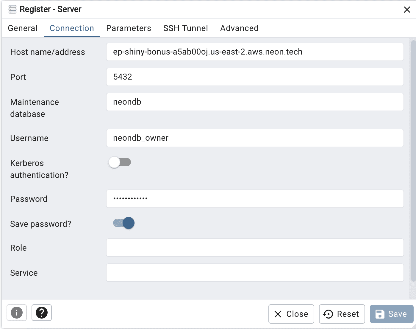 ep-...us-east-2.aws.neon.tech). - Port: The port number (default is